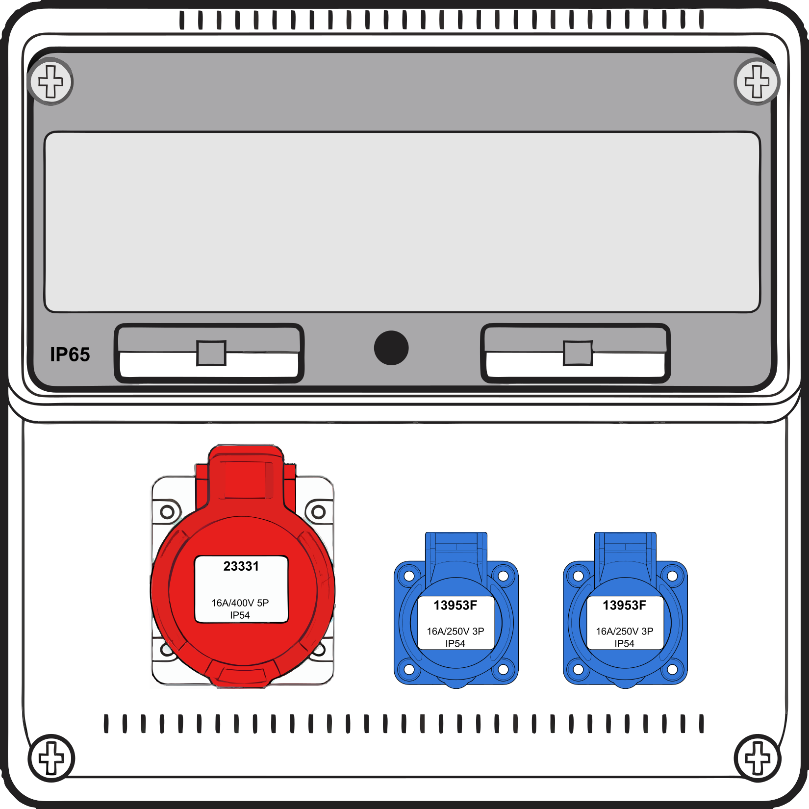 Boîte murale combi IP65 Medium (330 x 330 x 155mm) équipé de 1x 16A 5P 400V + 2x prises mono 230V (IP54) et protégé par un interrupteur différentiel + disjoncteurs (2), 10kA. Ces combinés muraux Famatel sont fabriqués conformément à la directive basse tension 2014/35/UE et sont livrés entièrement assemblés et câblés, conformément aux réglementations européennes