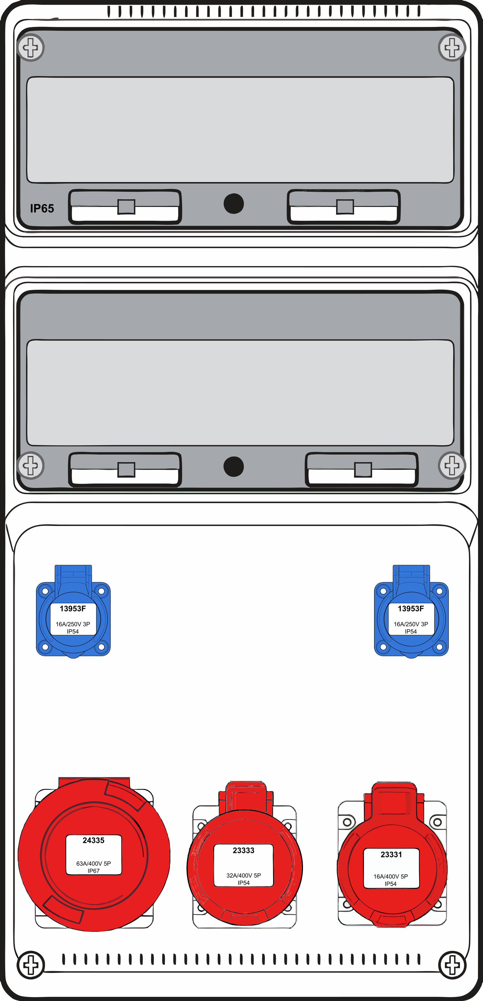 Boîte murale combi XLarge -1x 16A 5P 400V + 1x 32A 5P 400V + 1x 63A 5P 400V + 2x mono 230V - int + disj (4) - 10kA