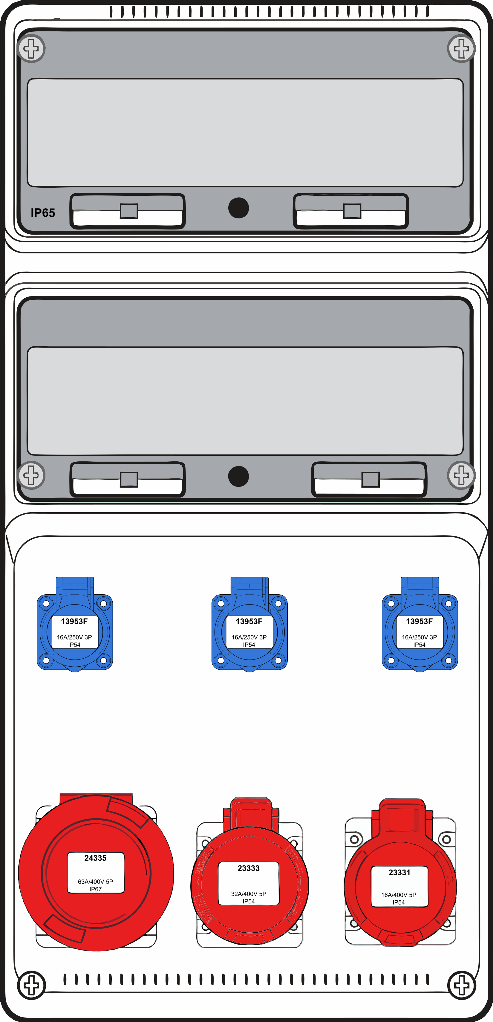 Boîte murale combi XLarge -1x 16A 5P 400V + 1x 32A 5P 400V + 1x 63A 5P 400V + 3x mono 230V - int + disj (5) - 10kA