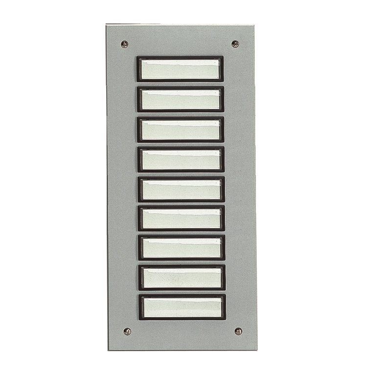 L'ETA 809 EV1 de Grothe est une sonnette argentée (9 boutons) avec plaque signalétique, en aluminium (anodisé). Cette cloche fonctionne sur un maximum de 24 V AC (1,5 A) / 24 V DC (1,0 A). Les dimensions de la cloche sont: 264 x 121 mm.