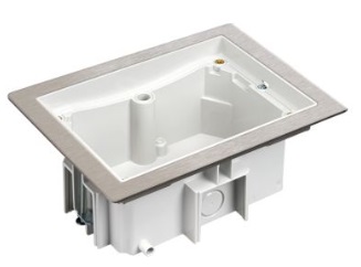 Boîte d'encastrement double (193 x 148 x 81 mm) en plastique sans halogène avec bord de support en acier inoxydable pour utilisation dans les sols techniques ou surélevés, finition grise. Equipé d'un système de drainage pratique pour éviter la condensation. A utiliser en combinaison avec le double support de mécanisme IP66 qui accueille 2x modules K45 et 1x découpe étroite K45.