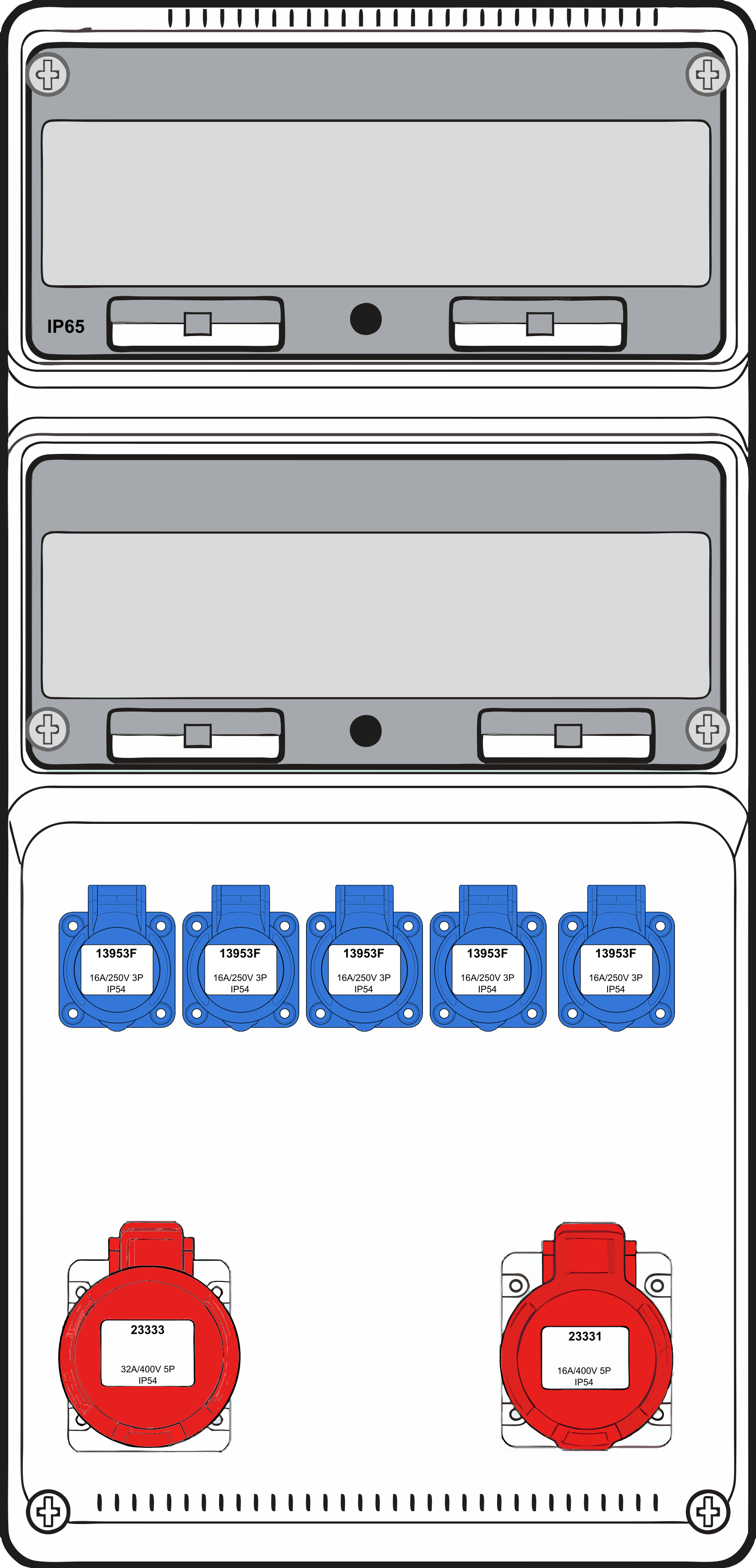 Wandcombinatie IP65 XLarge (330 x 685 x 155mm) uitgerust met 1x 16A 5P 400V + 1x 32A 5P 400V + 5x mono 230V stopcontacten (IP54) en afgezekerd met differentieelschakelaar + installatieautomaten (5), 10kA. Deze Famatel wandcombi’s zijn vervaardigd volgens de laagspanningsrichtlijn 2014/35/EU en worden volledig gemonteerd en bedraad geleverd volgens de EU-voorschriften.